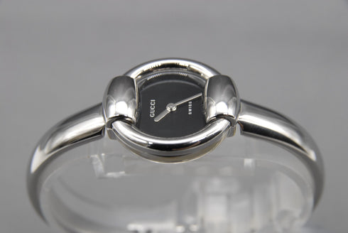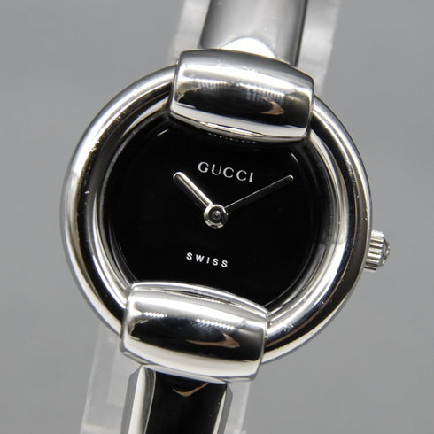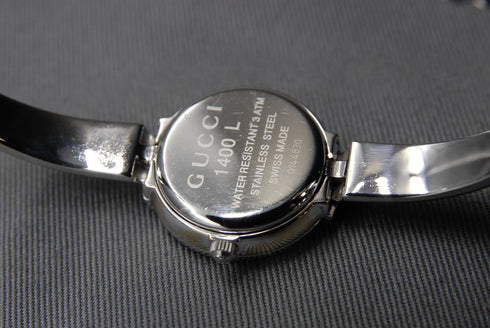 【NEAR MINT-】 GUCCI 1400L Silver Case Bangle Black Dial 25mm Quartz Women's...